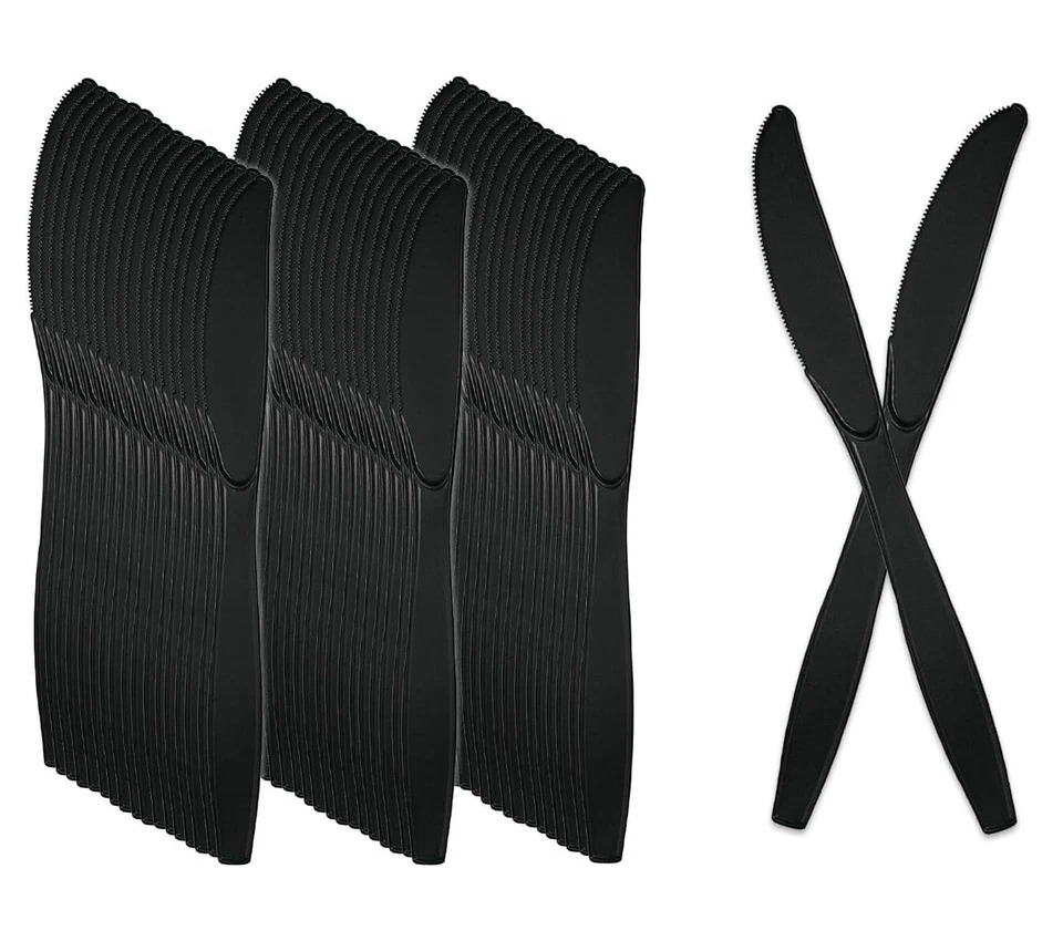 Heavy-duty re-usable black plastic knives. Supplied in a bulk pack of 1000, ideal for catering, events, and foodservice use.