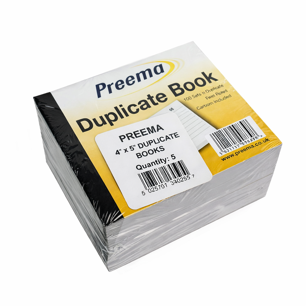 Preema 4" Ă— 5" duplicate books, supplied in a pack of 5, ideal for receipts, invoices, and order taking in shops and businesses.