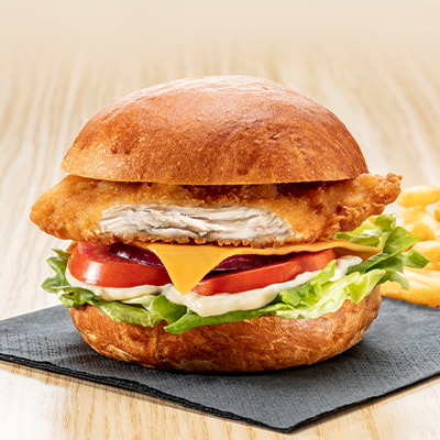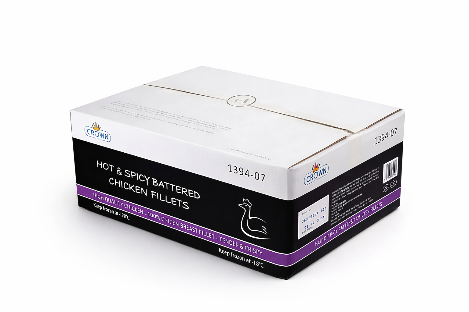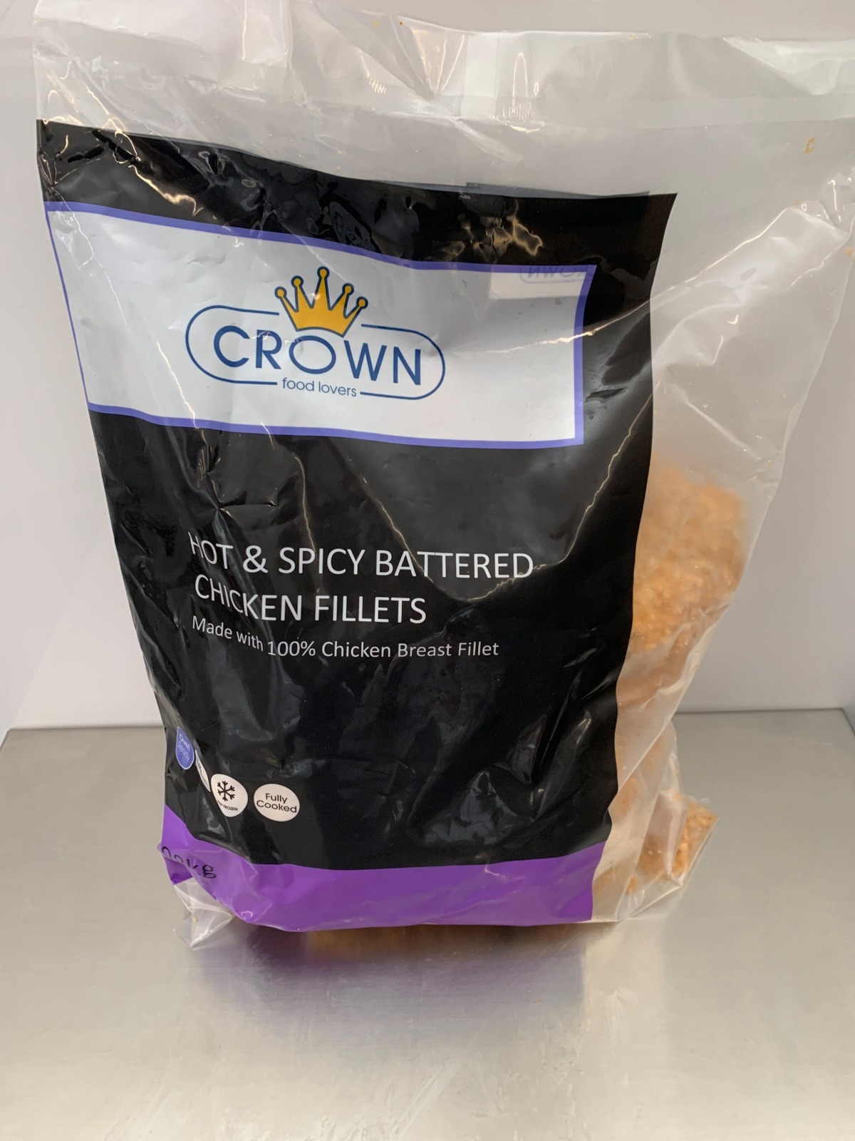 Crown Hot & Spicy Battered Chicken Fillet Burgers – 18 x 110g. Juicy, crispy fillets with a fiery kick.