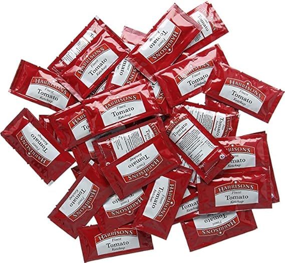 Convenient Harrisons Tomato Ketchup Sachets in 10g portions, available in a bulk pack of 200.