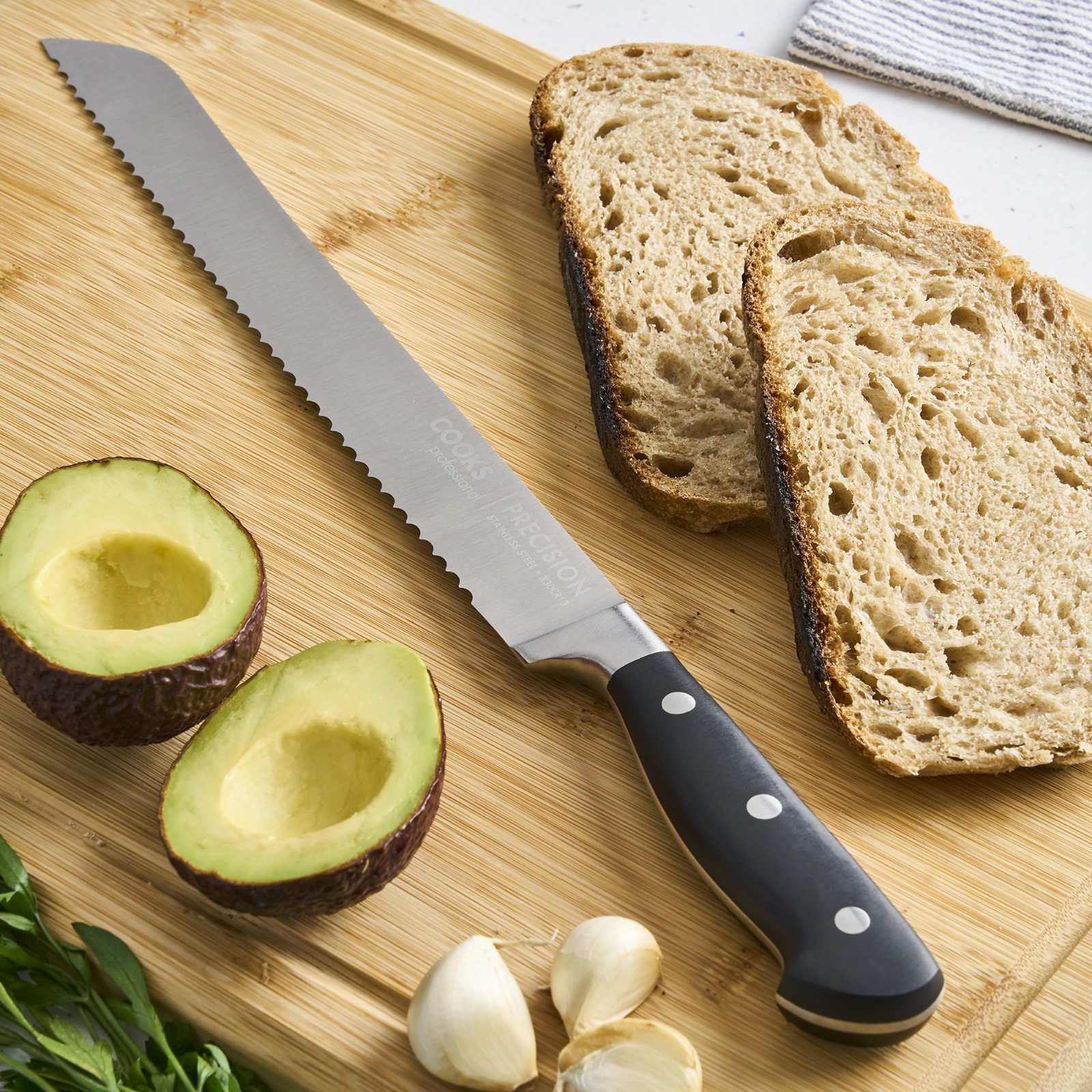 Sharp 10-inch serrated bread knife—perfect for slicing crusty and artisan breads cleanly.