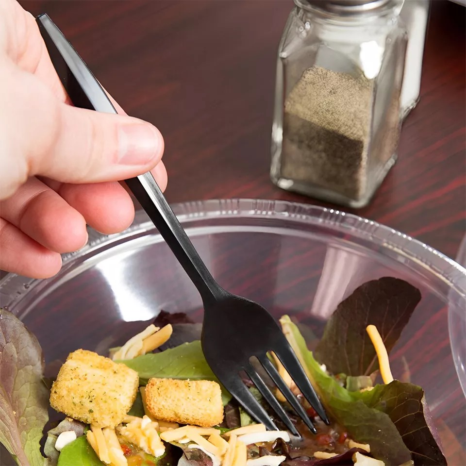 Durable, reusable black forks — MY PACK Heavy Duty Cutlery for high-volume catering and takeaway use.