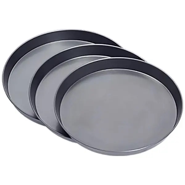 Heavy-duty black iron pizza pan for even baking and crisp, authentic crusts—ideal for ovens and pizza ovens.