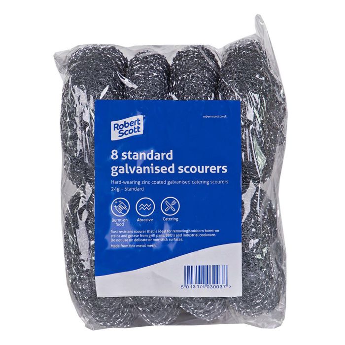 Heavy-duty W60 galvanised steel scourers designed for tackling tough grime and baked-on residues. Ideal for commercial kitchens, catering establishments, and industrial cleaning tasks.